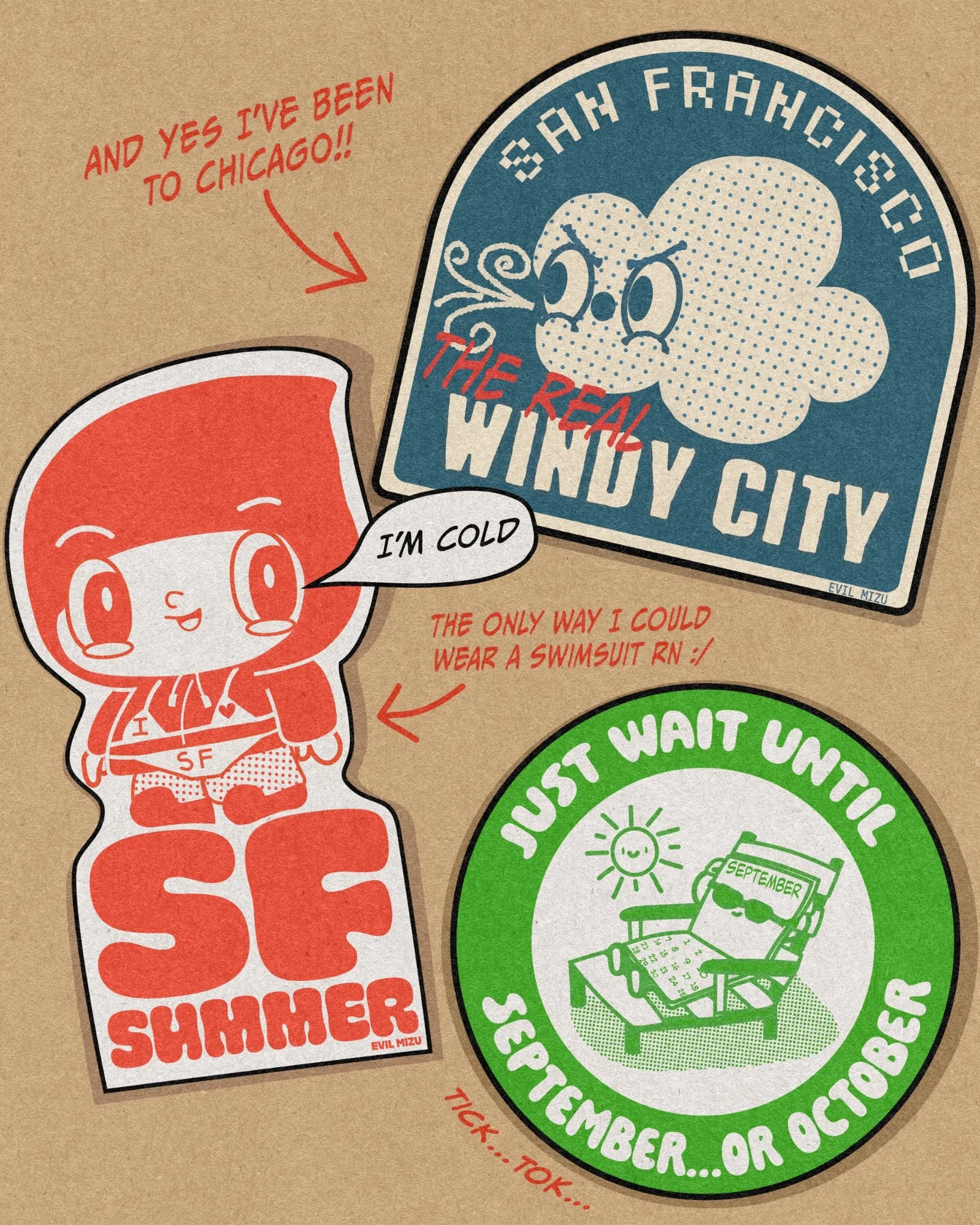 I made some stickers for Summer 2025! It was cold! And windy!! SAN FRANCISCO IS THE REAL WINDY CITY 💨 And u didn’t hear it from me but I heard that Chicago is like super hot and humid right now…meanwhile I almost blew away while trying to walk my dog this morning. I’M TRYING TO START BEEF 🥩